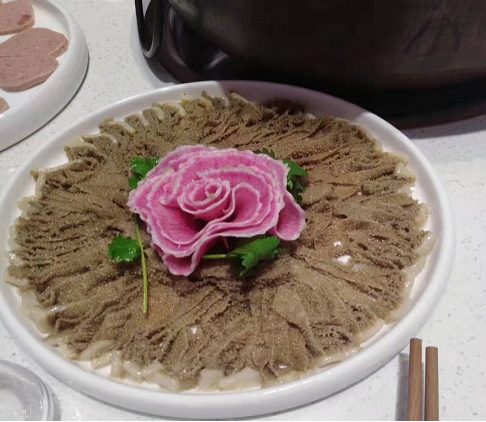 5、涮毛肚也是本店特色,毛肚新鮮脆嫩。零添加洗凈直接改刀裝盤帶毛肚底板一起涮食。蘸上芝麻醬,體會真正涮毛肚的滋味,絕對刷新食客對涮毛肚的觀念