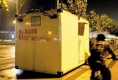 那么這個(gè)箱子到底干啥用的?別急,瞧瞧箱子上的廣告咱就恍然大悟了——“住人集裝箱租,每天6元,13071……”箱子北側(cè)還掛著一臺空調(diào)機(jī)箱。
