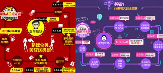 在京美大戰(zhàn)前期,國(guó)美在線推出32億現(xiàn)金券PK京東16億優(yōu)惠券,隨后聯(lián)合百度推出1分錢(qián)換6聽(tīng)啤酒暢飲世界杯活動(dòng),京東則推出0元玩轉(zhuǎn)萬(wàn)達(dá)活動(dòng),“免費(fèi)”成為了二者這個(gè)促銷(xiāo)階段的共同之處。進(jìn)入6月之后,國(guó)美在線提前截流京東3C大促,推出手機(jī)電腦真低價(jià)活動(dòng),時(shí)間比京東提前了1天。接下來(lái),二者主打的品類皆為家電、服裝,最后,雙方最高層領(lǐng)導(dǎo)將為自家商城站臺(tái),以“老牟專場(chǎng)”與“老劉專場(chǎng)”的對(duì)決形式展現(xiàn)。