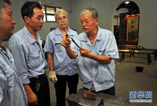 在杭州張小泉集團手工生產(chǎn)線上,“張小泉剪刀鑲鋼鍛制技藝”傳承人施金水(右一)在介紹制剪的“打下角”工序(2010年8月20日攝)。張小泉剪刀品牌始創(chuàng)于清康熙二年(1663年),其獨創(chuàng)的72道制剪工序讓張小泉剪刀數(shù)百年長盛不衰。