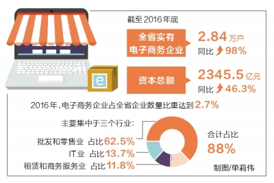 2016年,電子商務(wù)企業(yè)占全省企業(yè)數(shù)量比重達(dá)到2.7%,較上年同期提升1個百分點。全省電子商務(wù)企業(yè)主要集中于批發(fā)和零售業(yè)、IT業(yè)、租賃和商務(wù)服務(wù)業(yè)三個行業(yè),占比分別為62.5%、13.7%和11.8%,合計占比88%。