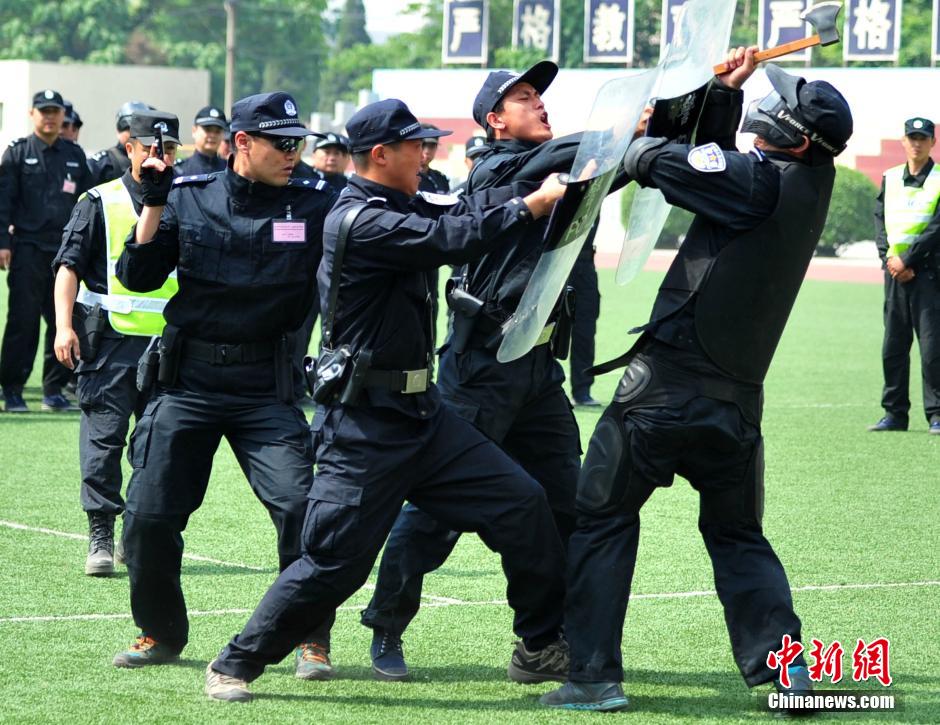 央廣網(wǎng)河南分網(wǎng)消息 據(jù)中國新聞網(wǎng)報道:5月6日,河北石家莊警察學(xué)校操場,多個“暴恐”實戰(zhàn)現(xiàn)場正真實上演驚恐一幕。教官扮演的歹徒高舉兩把斧頭猛砍過來,兩名手持盾牌公安警察,朝著襲擊方向用力頂上去,第三名警察迅速掏出手槍將歹徒擊斃。