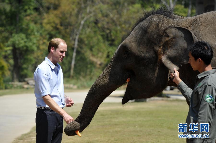 3月4日,英國劍橋公爵威廉王子給大象“然然”喂食。當日,英國劍橋公爵威廉王子來到云南省西雙版納傣族自治州探訪亞洲象種源繁育基地。 新華社記者胡超攝