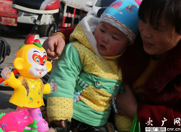 2月22日,一位小朋友在河南寶豐新世紀(jì)廣場花燈攤位前被猴燈吸引。