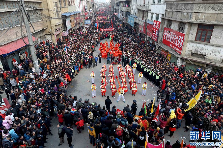 2月23日,河南省?h民間社火團體在古廟會上演出。