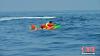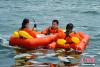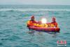 16名中國航天員和2名歐洲航天員,8月21日在山東省煙臺市附近海域圓滿完成了為期17天的海上救生訓(xùn)練任務(wù)。圖為訓(xùn)練期間,8月8日,受試人員坐在小艇上等待救援。 中新社發(fā) 朱九通 攝 -