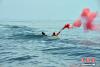 16名中國航天員和2名歐洲航天員,8月21日在山東省煙臺市附近海域圓滿完成了為期17天的海上救生訓(xùn)練任務(wù)。圖為訓(xùn)練期間,8月8日,參加訓(xùn)練的航天員使用海水染色劑以便于搜索人員發(fā)現(xiàn)。 中新社發(fā) 朱九通 攝 -