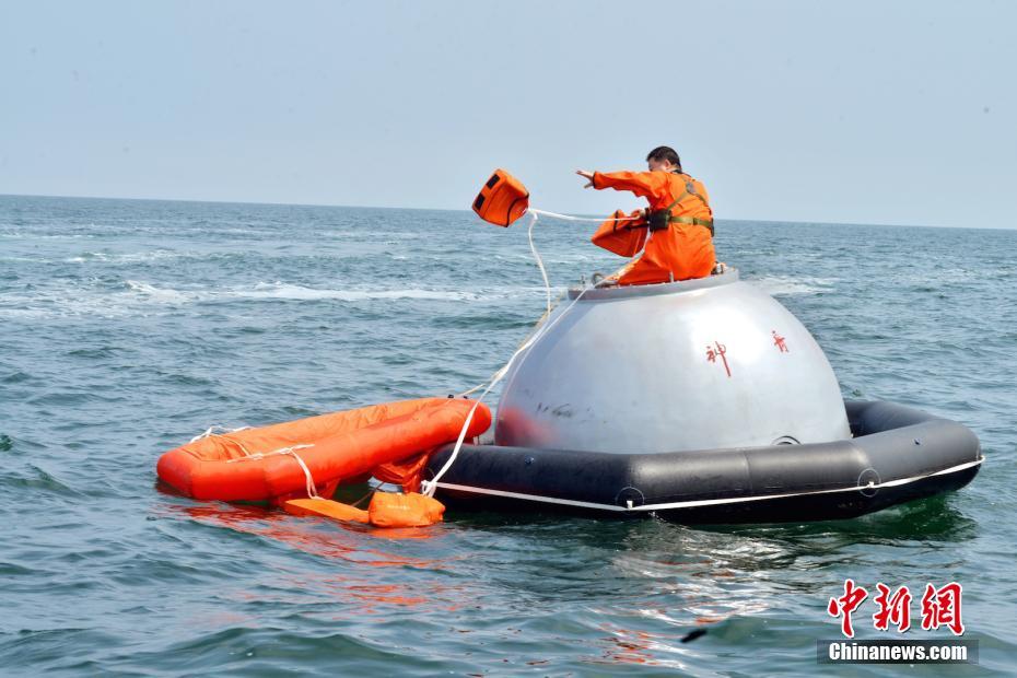 中歐航天員海上救生訓(xùn)練8月21日在山東省煙臺市附近海域圓滿完成。這次訓(xùn)練針對空間站載人飛行任務(wù)飛船應(yīng)急返回濺落海上開展專項訓(xùn)練。圖為三名參與訓(xùn)練的航天員與中國神舟飛船模擬返回艙。中新社記者 張素 攝 -