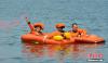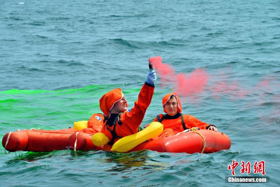 16名中國航天員和2名歐洲航天員,8月21日在山東省煙臺市附近海域圓滿完成了為期17天的海上救生訓(xùn)練任務(wù)。圖為訓(xùn)練期間,8月8日,參加訓(xùn)練的航天員在水上使用光煙信號管。 中新社發(fā) 朱九通 攝 -