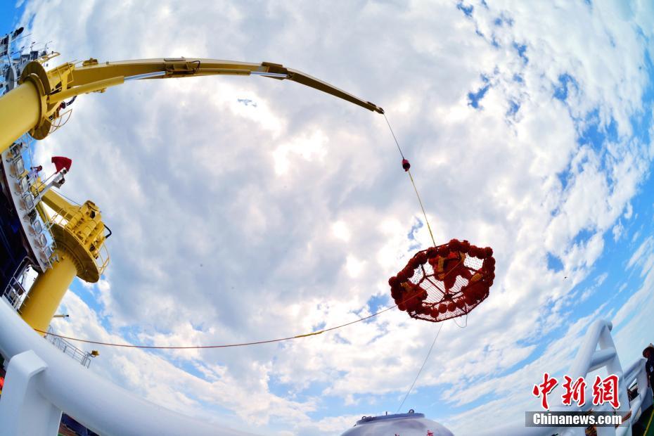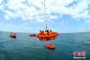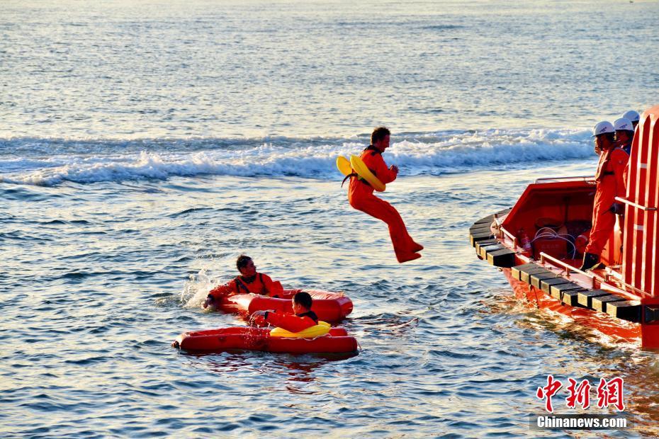 16名中國航天員和2名歐洲航天員,8月21日在山東省煙臺市附近海域圓滿完成了為期17天的海上救生訓(xùn)練任務(wù)。圖為訓(xùn)練期間,8月2日,甲板上的機械吊臂把救生吊籃起吊入水。 中新社發(fā) 朱九通 攝