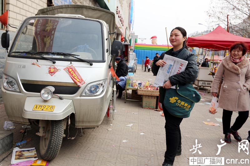 央廣網河南分網消息 2014年2月27日,農歷馬年正月二十八,豫北河南滑縣道口鎮(zhèn)傳統火神廟會第二天,位于縣城中心腹地的紅旗路段人頭攢動,熱鬧非凡,滑縣郵政局投遞員肩挎郵包,拎著分好的報刊和郵件,步履維艱,穿行在數以萬計的古廟會人流中,上門為沿街商戶、轄區(qū)居民,挨家挨戶為群眾投送報刊和郵件,用真情和汗水詮釋著愛崗與敬業(yè)。