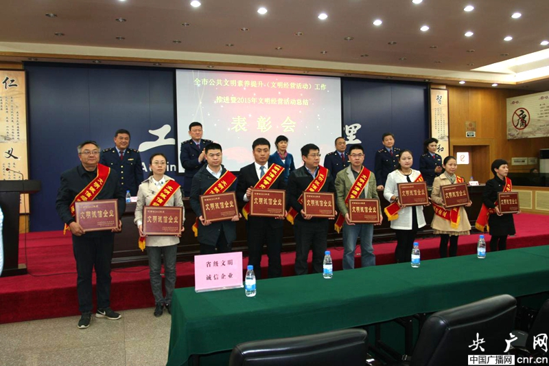 央廣網(wǎng)河南分網(wǎng)4月18日消息 4月18日,鄭州市工商局召開“全市公共文明素養(yǎng)提升(文明經(jīng)營(yíng)活動(dòng))工作推進(jìn)暨2015年文明經(jīng)營(yíng)活動(dòng)總結(jié)表彰會(huì),對(duì)2015年度文明經(jīng)營(yíng)活動(dòng)中成績(jī)突出的登封市恒泰農(nóng)貿(mào)批發(fā)市場(chǎng)等10個(gè)市場(chǎng)、鄭州鐵路局鄭州機(jī)務(wù)段等22個(gè)企業(yè)、鄭州市金水區(qū)寶視達(dá)眼鏡廣電路店等19個(gè)商戶予以了表彰。