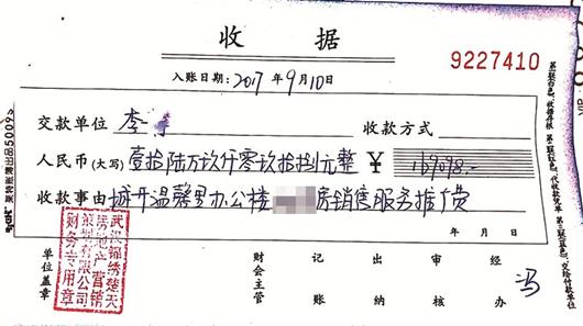 收據(jù)顯示,李女士所交的“推廣費”是武漢錦繡楚天房地產(chǎn)營銷策劃有限公司所收。記者聯(lián)系到該公司“陳總”,詢問這筆錢該不該收!澳阏f呢?”對方反問記者,并說,“我很忙,不想多談,要想退錢,可以去打官司。”