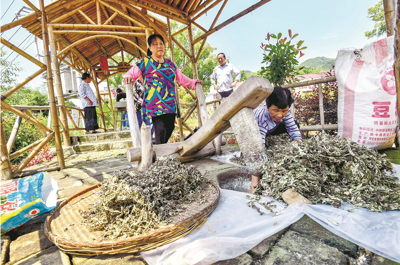 圖為村民用古老的石臼提取艾絨