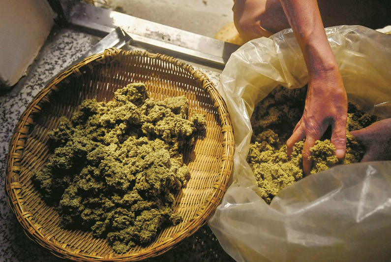 雖然現(xiàn)代化的設(shè)備很多,但當(dāng)?shù)厝杂斜3质止ぶ圃斓淖非蟆4迕駚淼教镩g,割下高高的艾草,再用手一點點揪下艾葉,保證艾稈與葉子不混淆。艾葉單獨晾曬,干透后放入石臼,反復(fù)捶打,直到把一大把艾葉捶成一坨艾絨。