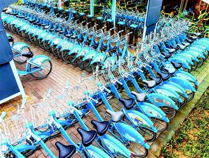 圖為在東湖綠道楚風(fēng)園站點(diǎn),停滿了“車小藍(lán)”公共自行車。(記者 梅濤 攝)