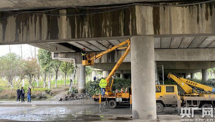 圖為:工作人員正在對(duì)破損橋面進(jìn)行檢測(cè) 記者王超 攝