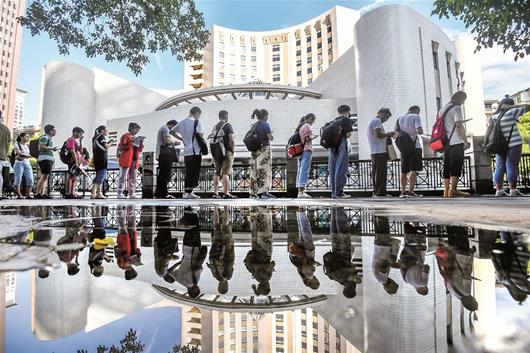 天氣炎熱,湖北省圖書館、武漢市圖書館內(nèi)閱讀納涼的讀者爆棚,兩家圖書館日均涌入1萬多人。左圖為昨日清晨,讀者早早地在武漢市圖書館外排隊等待開門。楚天都市報記者徐穎蕭顥攝影報道