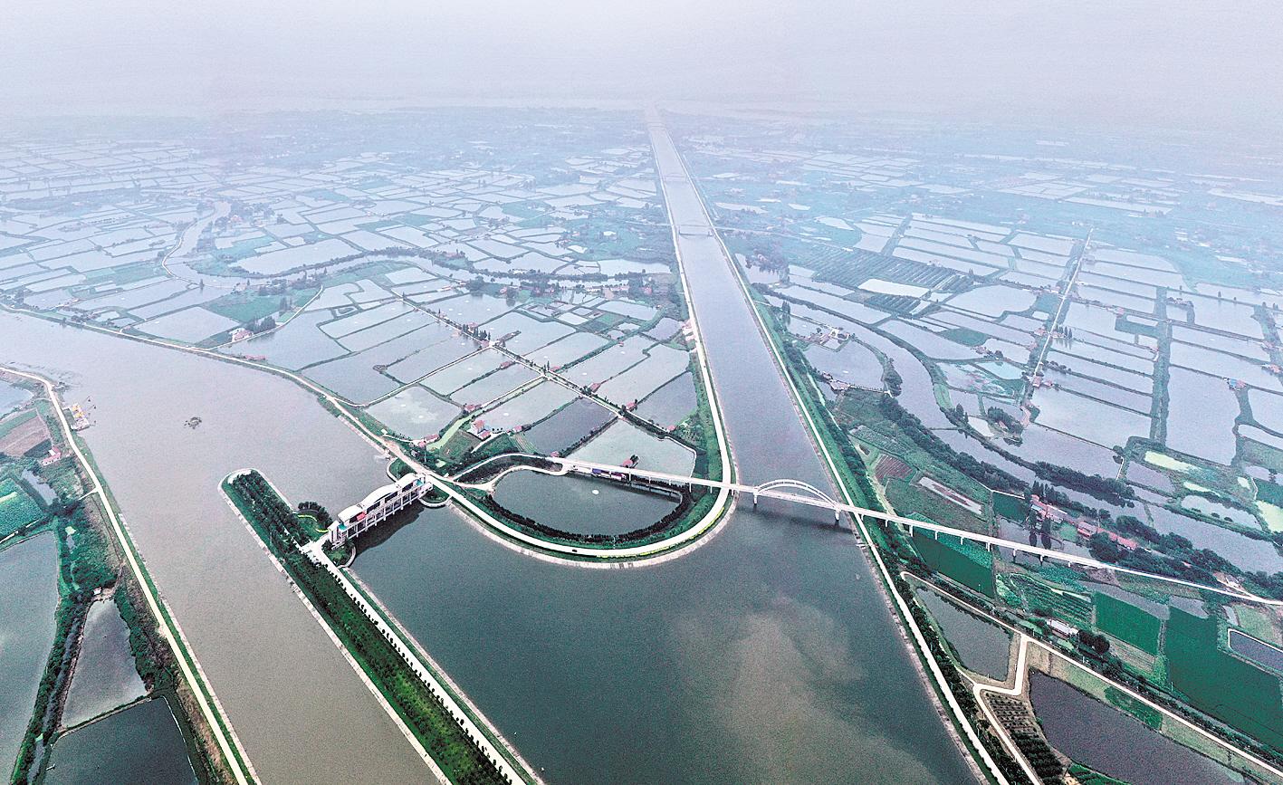 7月14日,為減輕長湖防汛壓力,引江濟(jì)漢工程開始為長湖撇洪。圖中河道,左為連接長湖的拾橋河道,右為引江濟(jì)漢主干渠。 (湖北日報全媒記者 劉曙松 通訊員 黃志剛 攝)