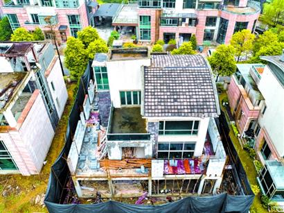 站在小區(qū)一棟小高層樓上,記者看到,灝區(qū)多棟別墅與旁邊尚未住人的別墅相比,頂層結(jié)構(gòu)已經(jīng)發(fā)生變化。兩棟已經(jīng)打圍卻停止施工的別墅頂層,明顯可見還未澆筑的鋼筋骨架以及新砌的磚塊。