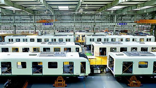 湖北日報訊 圖為:昨日,在總裝生產(chǎn)車間內(nèi)地鐵列車正在組裝中。當日,在武漢市黃陂區(qū)中車武漢長客公司,首列“武漢造”時速100公里A型地鐵車輛下線試跑。