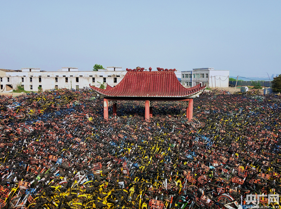 近日,湖北省武漢市洪山區(qū)世茂林嶼岸小區(qū)附近的一塊空地上堆滿了共享單車,空地中的涼亭變“孤島”。