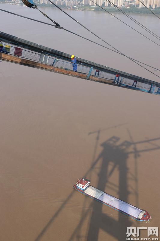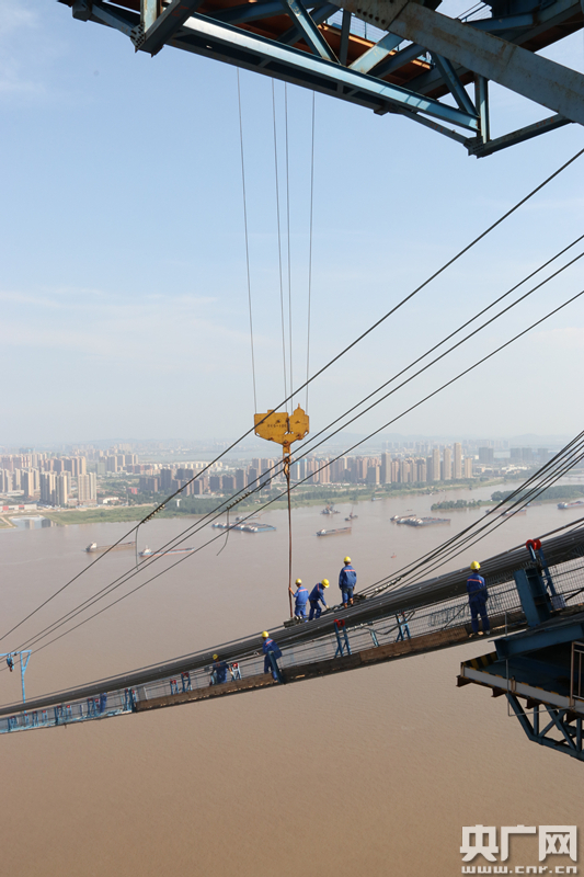 央廣網(wǎng)武漢7月18日消息(記者黃炎秋 張卓 熊峰)位于湖北武漢的楊泗港長江大橋是一座雙塔雙層地錨式鋼桁梁公路懸索橋,主跨1700米,一步跨越長江。建成后將成為世界上跨度最大的雙層懸索橋。目前正值高溫天氣,工人們每天在200多米高的“云端”穿梭,在南北兩岸的貓道上,完成主橋主纜架設(shè)和引橋承臺、墩身、箱梁施工。