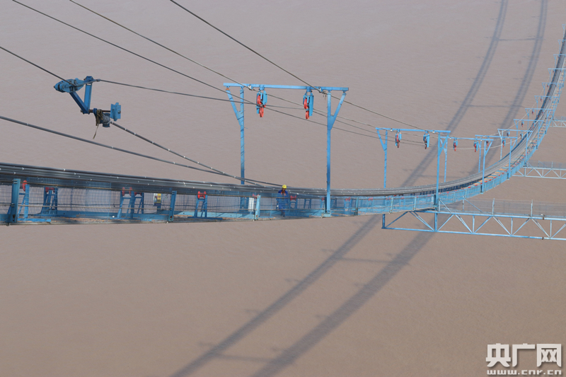 圖為工人們在貓道上作業(yè) 張卓/攝