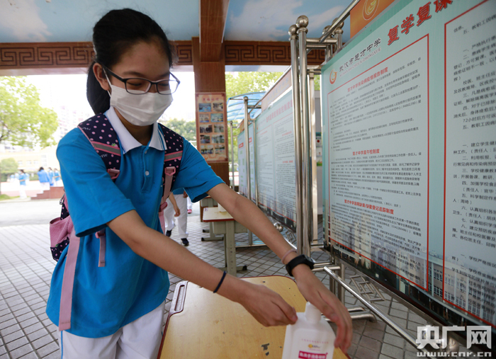 圖為:2020年8月28日,在湖北省武漢市楚才中學(xué),一名七年級(jí)學(xué)生正在進(jìn)行入教室前的消毒。(央廣網(wǎng)發(fā) 通訊員王方攝)