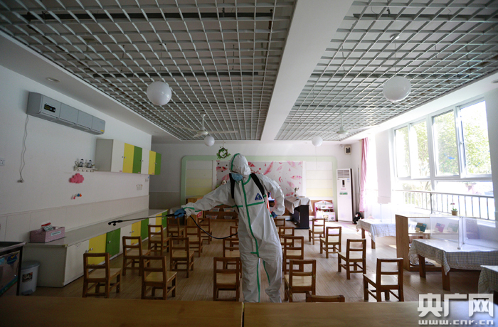 圖為:2020年8月28日,在湖北省武漢市華中師范大學(xué)附屬鐵橋幼兒園內(nèi),消防員正在對(duì)班級(jí)教室進(jìn)行全面消殺。(央廣網(wǎng)發(fā) 通訊員王方攝)