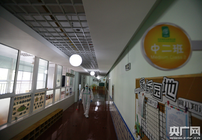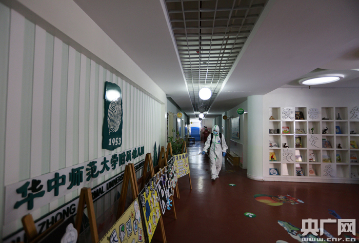 圖為:2020年8月28日,在湖北省武漢市華中師范大學(xué)附屬鐵橋幼兒園內(nèi),消防員正在對(duì)走廊區(qū)域進(jìn)行全面消殺。(央廣網(wǎng)發(fā) 通訊員王方攝)