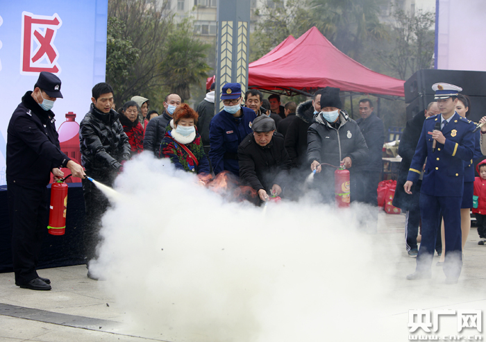 圖為:12月10日,在湖北省荊州市監(jiān)利市玉沙廣場,社區(qū)網(wǎng)格員和市民一同體驗利用滅火器撲救油盆火災(zāi)。央廣網(wǎng)發(fā) 通訊員王方 攝