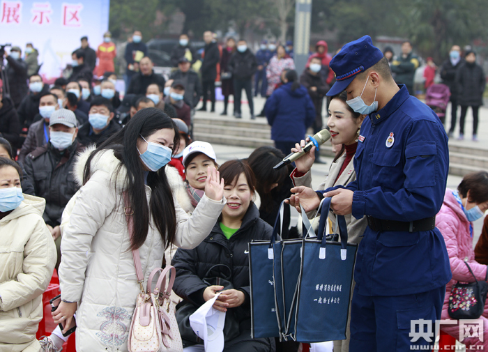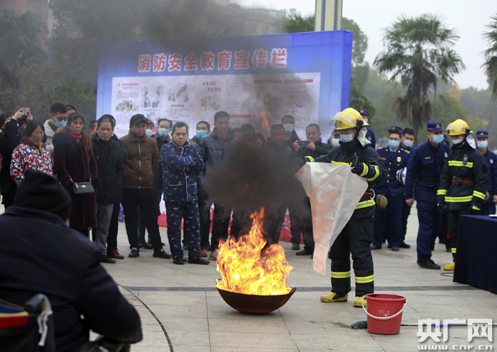 圖為:12月10日,在湖北省荊州市監(jiān)利市玉沙廣場,消防員正向市民們演示油鍋起火后的正確處置方法。央廣網(wǎng)發(fā) 通訊員王方 攝