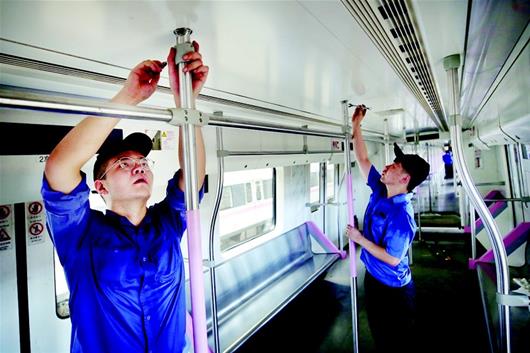 圖為8月2日,地鐵2號線首批33輛列車全部完成架修工作,重獲新生后繼續(xù)投入運營。圖為工作人員在列車內(nèi)部檢修 通訊員產(chǎn)啟斗黃彥供圖