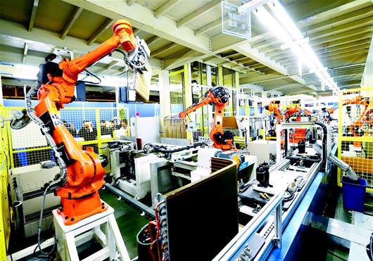 湖北日報訊 圖為美的集團武漢制冷設(shè)備有限公司智能制造生產(chǎn)線上的機器手臂在運行。(記者 張朋 攝)
