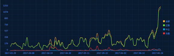 值得一提的是,荊楚網(wǎng)絡(luò)大數(shù)據(jù)輿情中心監(jiān)測發(fā)現(xiàn),今年湖北黨代會的預(yù)熱期長達約半年之久,早在2016年12月,已經(jīng)有不少與黨代會相關(guān)的信息出現(xiàn),在2017年1月的湖北省兩會期間,更是出現(xiàn)了一個輿論高峰期。而最近3個月,黨代會的相關(guān)報告也一直居高不下,各界對黨代會的關(guān)注度一直保持在一個較高的水準(zhǔn)。6月25日,黨代會的召開將輿論情緒推向頂峰,并且還在不斷上升之中。