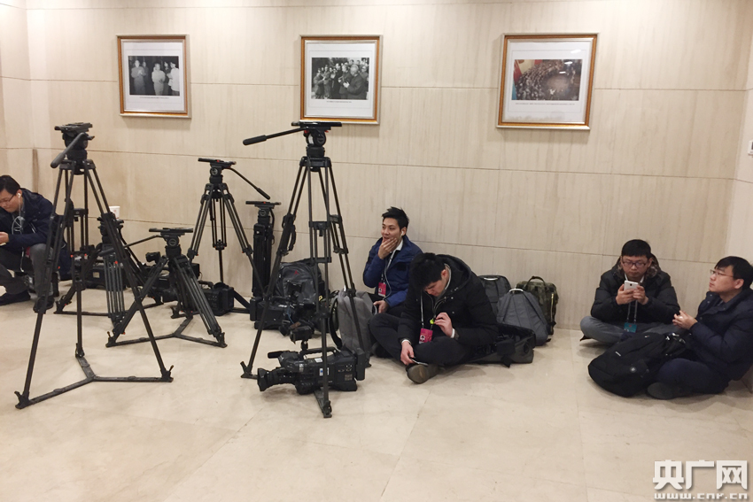 •   圖為正在會(huì)場(chǎng)外席地而坐等待的記者。(記者熊峰 攝)