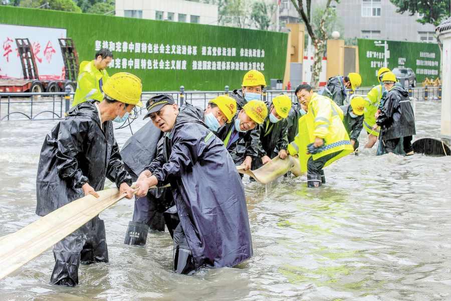 7月6日早晨,武漢市武昌區(qū)洪山路與東一路十字路口因大暴雨漬水,武昌區(qū)水務(wù)和城管搶險(xiǎn)人員在現(xiàn)場拖管抽排漬水。
