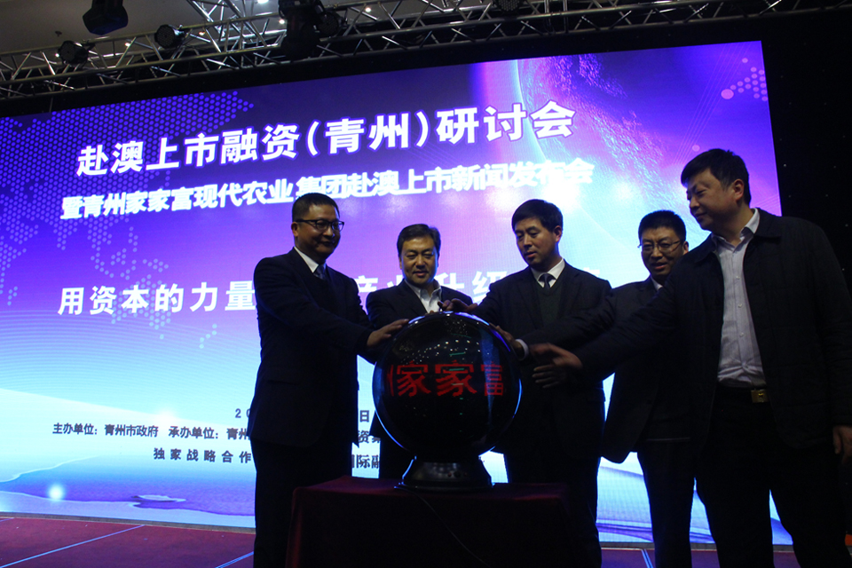 2015年3月17日,由青州市政府主辦,青州市金融辦、展騰投資集團(tuán)、青州家家富現(xiàn)代農(nóng)業(yè)集團(tuán)承辦,國際融資雜志獨(dú)家戰(zhàn)略支持的“赴澳上市融資(青州)研討會暨青州家家富現(xiàn)代農(nóng)業(yè)集團(tuán)赴澳上市新聞發(fā)布會”在山東青州舉行。青州市各級政府領(lǐng)導(dǎo)、有關(guān)金融機(jī)構(gòu)主要負(fù)責(zé)人、重點(diǎn)上市后備資源企業(yè)參與了此次研討會,此外,來自全國的投資人、專家學(xué)者也到會演講、交流。