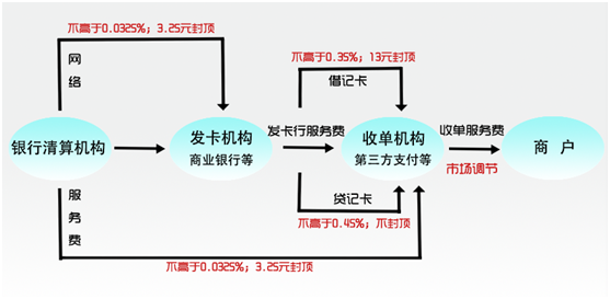 一般,銀行卡刷卡手續(xù)費主要分為三部分:收單服務費、發(fā)卡行服務費和網(wǎng)絡服務費。新政實施后,銀行卡刷卡手續(xù)費的收取如下圖所示。(注:借記卡指儲蓄卡一類;貸記卡指信用卡一類)