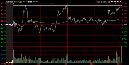今日,美的集團(tuán)早盤迅速拉升一度漲1%,隨后有所下挫,臨近午盤時(shí)一度拉升至當(dāng)日最高點(diǎn)。該消息傳出后快速下行,保持低位徘徊,截至收盤美的集團(tuán)漲0.89%,報(bào)43.16元/股。
