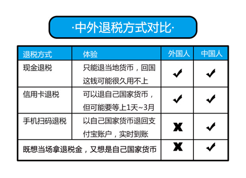 現(xiàn)金退稅是退回當?shù)刎泿牛畲蟮膯栴}是當?shù)貛艓Щ貒赡軙䶮o用武之地;而信用卡退稅,游客可以拿到自己國家的貨幣,但是,一般要等候三五天時間,不像現(xiàn)金退稅這樣可以當場“落袋為安”,用手機退稅一秒到賬,收到的是人民幣。