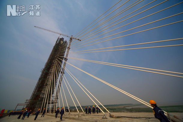 如皋長江大橋建設(shè)者從85米高的主塔及斜拉索前走過。