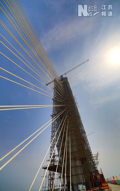 這是5月20日拍攝的85米高的如皋長江大橋主塔。