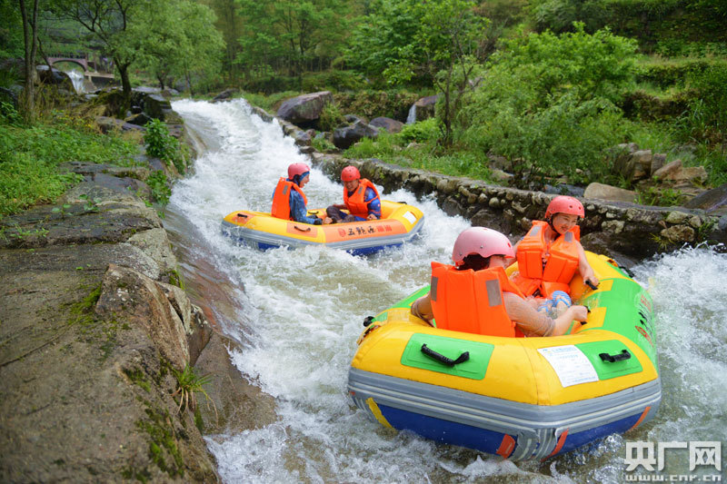當(dāng)天下午1點(diǎn)多鐘,各地游客紛涌而至,大家穿上泳衣爭(zhēng)先恐后地坐上皮筏艇,體驗(yàn)水上極速的樂(lè)趣。在河道中,皮筏艇一個(gè)接著一個(gè)從上游漂下,游客們一路尖叫一路歡笑,讓人心跳加速,大家盡情地享受著河水帶來(lái)的清涼,大呼過(guò)癮。來(lái)自陜西的陶女士漂完全程后,開心地說(shuō):“婺源不僅風(fēng)景很美,漂流也非常的刺激過(guò)癮,不虛此行!