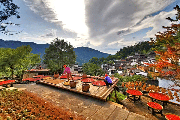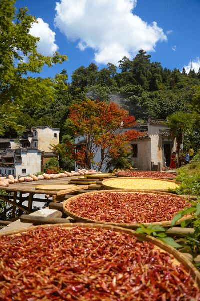 立秋將至,篁嶺古村的農(nóng)作物普遍豐收,又到了一年“曬秋”最美季。篁嶺村民們將收獲來的紅辣椒、玉米、南瓜和菊花等色彩斑斕的農(nóng)作物,晾曬在依山而建的徽派民居的曬樓上,揭開新一年曬秋紅火的序幕。(圖文/方華彬)
