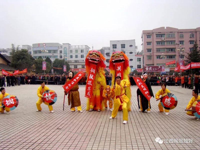 客家燈彩——活靈活現(xiàn)。銅鼓客家獅、太平燈、漁樵耕讀、七鯉搶蝦等燈彩都是群眾喜聞樂(lè)見的歡慶活動(dòng),均入選了省級(jí)非物質(zhì)文化遺產(chǎn)保護(hù)名錄。其中,銅鼓客家獅將獅由“怪獸”化為“神獸”,并通過(guò)舞蹈、武術(shù)、雜技、戲劇等多樣性表演來(lái)表達(dá)新春祝福。銅鼓客家獅一般從每年農(nóng)歷初一始在祠堂內(nèi)請(qǐng)神、拜獅、起蘸,正月十五勾燈結(jié)束。其間,每到一村先尋一開闊地表演孫悟空、豬八戒、沙和尚降獅(三僧伴舞風(fēng)趣幽默,獅有熊獅、眼獅、悶獅等動(dòng)作);另有疊花架,十八般武藝對(duì)練,雜技表演等,全套表演人數(shù)十四人,時(shí)間約二小時(shí)左右。表演結(jié)束后由悟空引獅至各家送福送喜。