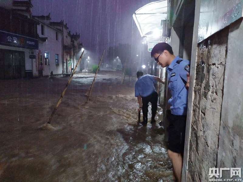 當(dāng)晚7時許,沱川鄉(xiāng)的強降雨已持續(xù)了4個多小時,洪水造成理坑村及沿河村落被淹,村下村敬老院附近電箱損壞,學(xué)?盏乇谎蜎]。面對突發(fā)的災(zāi)情,沱川派出所立即啟動防汛處置應(yīng)急預(yù)案,調(diào)集全部警力,所長張小波帶隊,奔赴災(zāi)區(qū),疏通水毀道路、搶救受災(zāi)財物、轉(zhuǎn)移被困群眾。