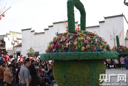 陽春三月,婺源夢里老家舉辦“探花節(jié)”,五彩繽紛的花朵把廣場、街道裝扮一新,吸引了眾多游客前來賞花游玩。圖為3月15日,游客在婺源夢里老家用五彩繽紛花朵裝扮一新的“花街”參觀游覽。(央廣網(wǎng)發(fā) 通訊員單長華攝)