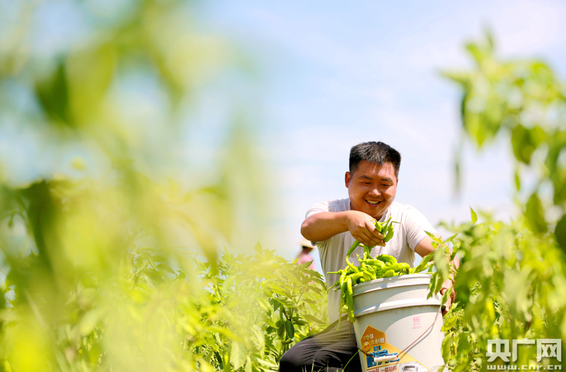 2020年6月16日,江西省吉安市吉水縣雙村鎮(zhèn)豐凱農(nóng)業(yè)辣椒產(chǎn)業(yè)基地一片歡聲笑語,村民正在采摘有機(jī)辣椒。